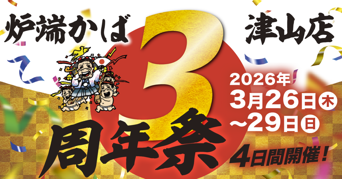 炉端かば津山店は、オープンから3周年を迎えます。 この節目を迎えられるのは、 日頃よりご来店いただいている皆様のおかげです。 心より御礼申し上げます。 感謝の気持ちを込めて、 下記日程にて 3周年祭を開催いたします。 炉 […]