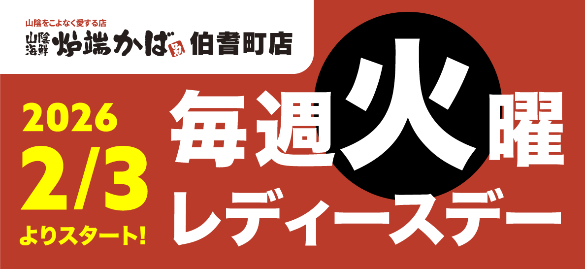 炉端かば伯耆町店にて、 2/3(火)より毎週火曜 レディースデーを開催いたします! ※レディースデーとは、 女性のみのグループでご来店されたお客様を対象に、 一部商品を除きお会計金額が 50%OFF となる […]